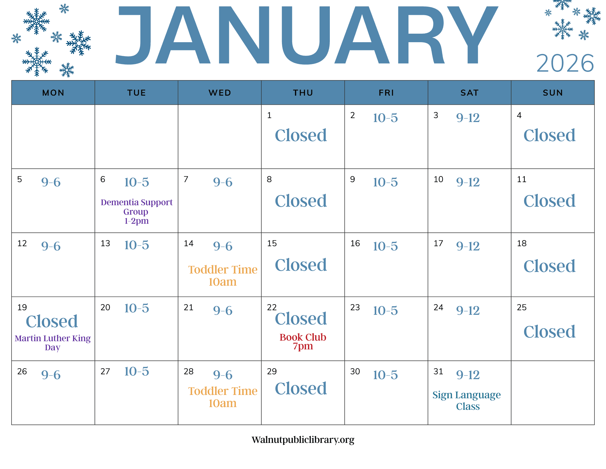 The Walnut Public Library is a non-profit organization supporting Walnut and the surrounding areas by providing a wide array of print, audio and online resources, onsite wi-fi, public computers, children’s programs and more.