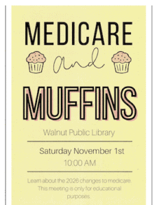 Walnut Public Library Saturday November 1st 10:00 AM Learn about the 2026 changes to medicare. This meeting is only for educational purposes.