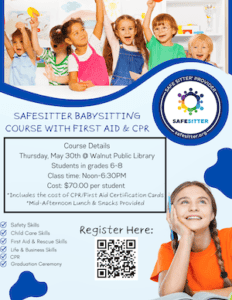 Join us on your first day of Summer and become a certified babysitter! Contact the library with any questions! Students grades 6-8 only! Cost is $70.00 per student Includes the cost of First Aid/CPR cards Mid-Afternoon Snack & Lunch will be provided Register Here: